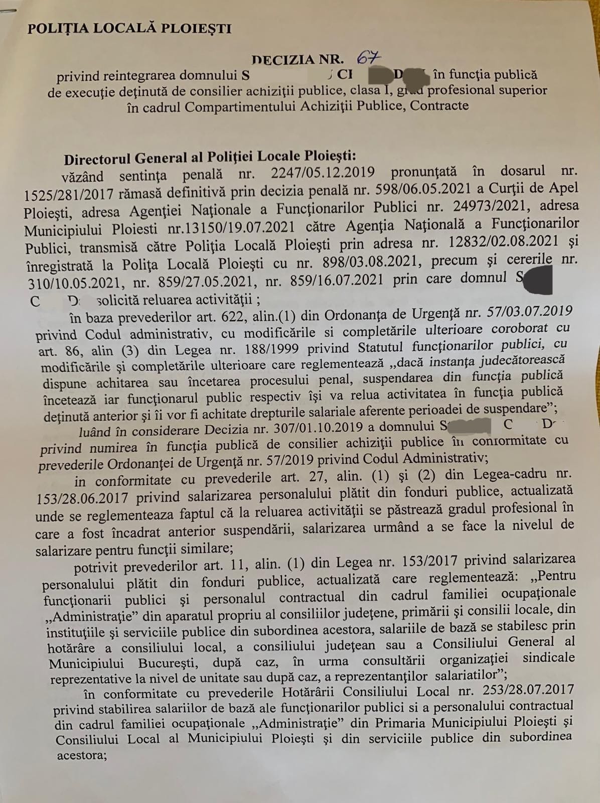 Pe scurt, Politia Locala Ploiesti dupa ce a emis decizia nr 67 prin care S.C.D este reangajat conform deciziei definitive ale instantei cu plata salariilor pe o perioada de peste 5 ani de zile, trebuia să il introduca în comisia de disciplină pe S.C.D in baza adreselor de la Agenția Națională de Integritate și Agenția Națională a Funcționarilor Publici .