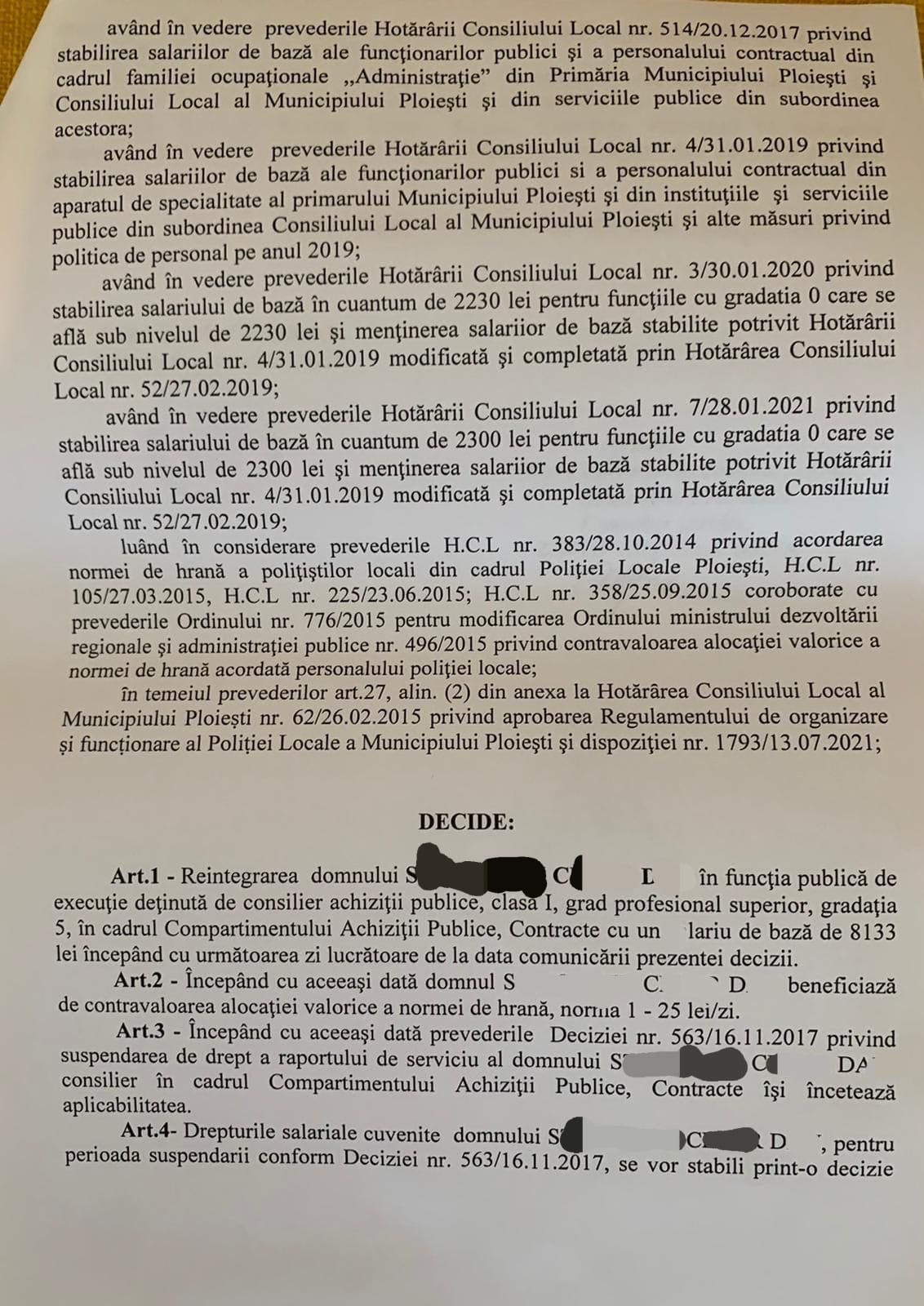 Acesta s-a adresat si instantei, in civil, unde – prin Hotarârea 2831/2021 a Tribunalului Prahova care a fost emisa in data de 16.11.2021, o hotarare prin care reclamantul a castigat din nou despăgubiri egale cu salariile indexate, majorate si reactualizate si cu celelalte drepturi de care ar fi beneficiat pe întreagă perioadă de suspendare a contractului individual de muncă si reancadrarea pe postul de functionar public detinut anterior la achizitii din cadrul Politiei Locale Ploiesti.