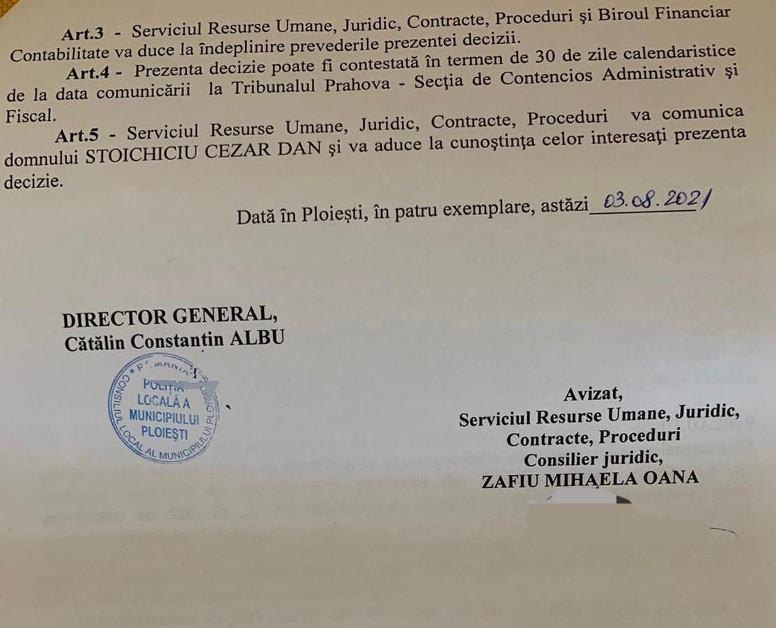 Fostul sef Achizitii al Politiei Locale Ploiesti a castigat in instanta procesul care a durat ani de zile pana cand s-a decis ca acesta trebuie sa fie repus in drepturi.