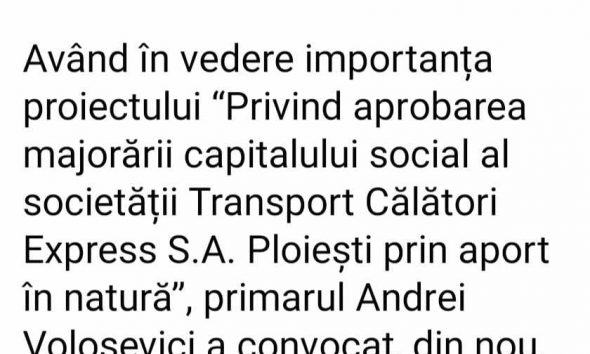 Proiectul de hotarare privind majorarea capitalului social, prin aport in natura, pentru esalonarea datoriilor la ANAF nu a a vut din nou cvorum in sedinta Consiliului Local Ploiesti de ieri. TCE este la un pas de blocarea conturilor datorita performantelor extraordinare ale edilului si ale administratiei la firul ierbii impuse de acesta, precum si datorita … Continuă lectura Edilul Andrei Volosevici după sedinta Consiliului Local Ploiesti de ieri: „Inteligenta ma urmărește de multe ori dar….eu sunt mult mai rapid”!