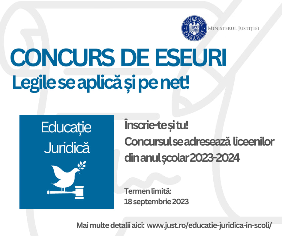 Dăm startul unui nou concurs de eseuri la nivelul Ministerului Justiției prin care invităm tinerii să fie curioși și să descopere efectele juridice ale prezenței lor online.
