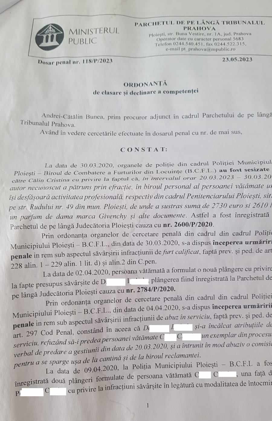 Ca să nu se ,,sperie” domnii de la Parchetul de pe langă Tribunalul Prahova , o să le spunem ,,Felicitări” din start și nu la modul ironic, pentru că prin Ordonanța 118/P/2023, au concluzionat foarte corect juridic și legal, așa că încă o dată Felicitări .