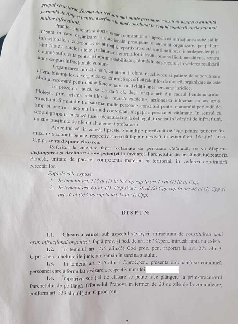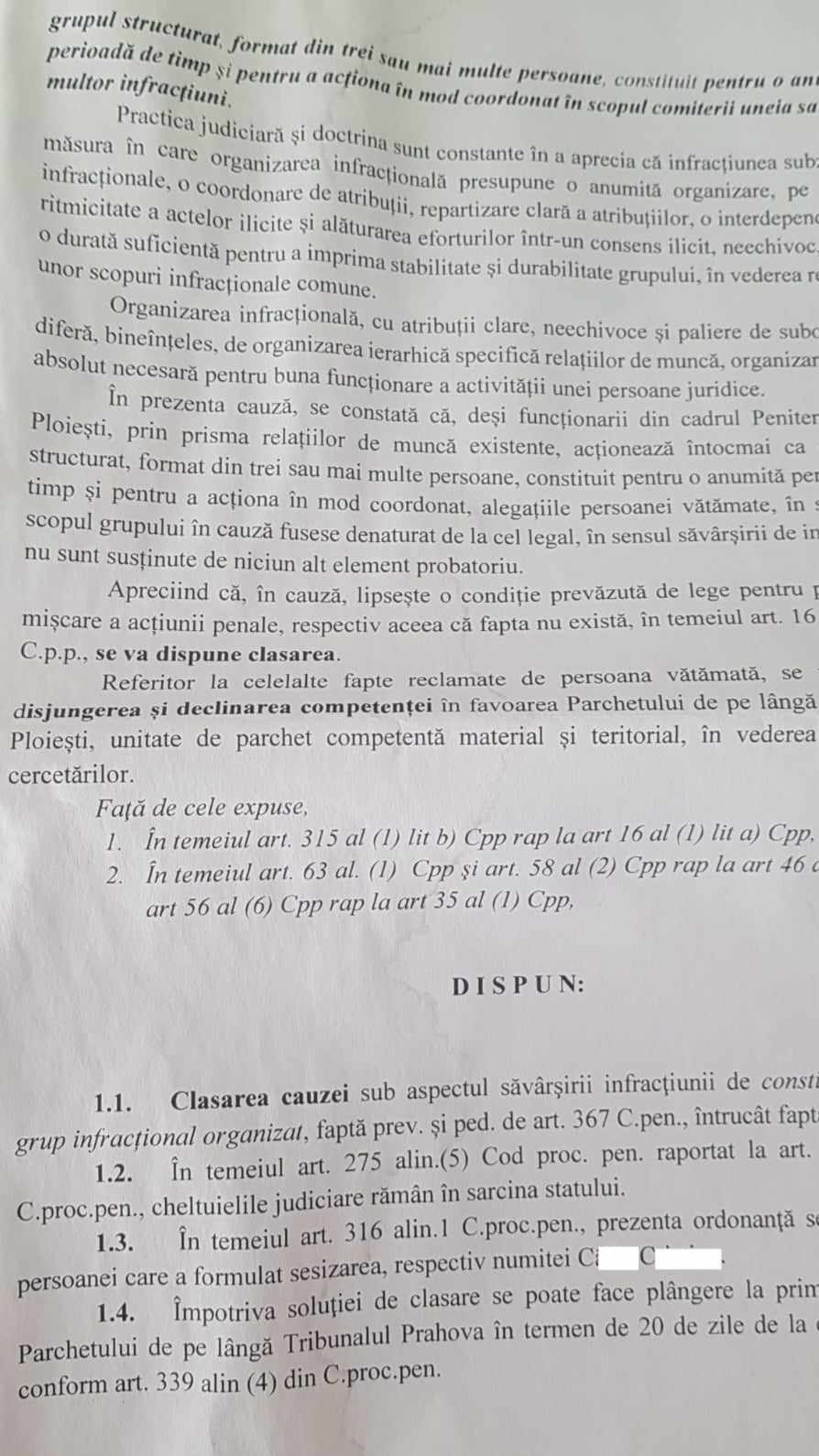 Dar de ce acest rezultat??? Păi cităm din ordonanță,, deși funcționarii din cadrul Penitenciarului Ploiești, prin prisma relațiilor de muncă existente, acționează întocmai ca un grup structurat, format din trei sau mai multe persoane, constituit pentru o perioadă de timp și pentru a acționa în mod coordonat, alegațiile persoanei vătămate, în sensul că scopul grupului în cauză fusese denaturat de la cel legal, în sensul săvârșiri de infracțiuni, nu sunt susținute de niciun alt element probatoriu”.