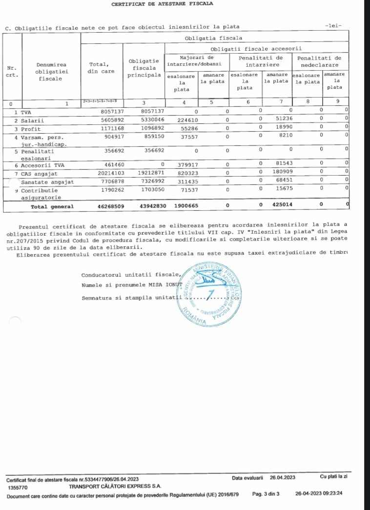 Conform Certificatului de Atestare Fiscala nr 5334477906 din 18.04.2023, TCE are urmatoarele datorii la stat si rugam cititorii si consilierii locali sa citeasca cu atentie punctele 5, 6 si 7 iar organele de cercetare penala poate constata punctele 7 si 8, infractiunile, stopaj la sursa (CAS angajat si sanatate angajat).