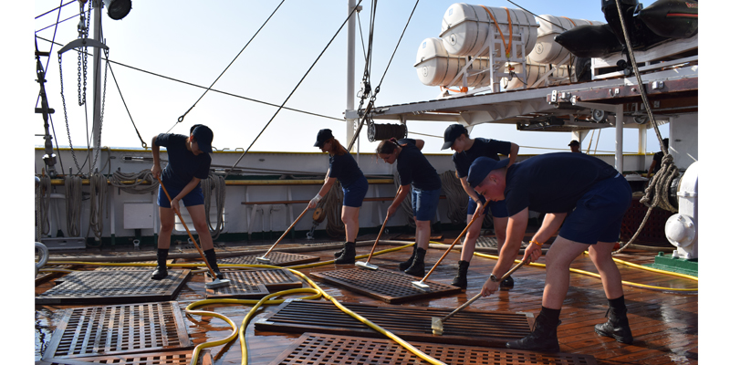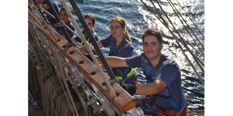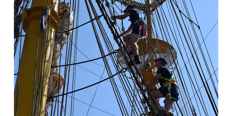 Ambarcați la nava-școală cu doar o săptămână înainte de plecarea în marș, cei 64 de studenți de anul II ai Academiei Navale „Mircea cel Bătrân” au avut la dispoziție un timp destul de limitat pentru a exersa, „la rece”, rolurile de brațare a vergilor, precum și urcările în arboradă.