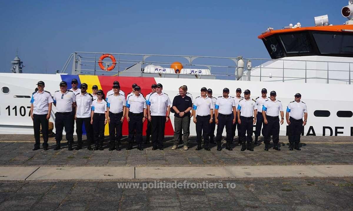 Oficialul a fost întâmpinat de comandantul navei, domnul comisar de poliţie Codin AVRAM, care a făcut o trecere în revistă a echipajului aflat la bord şi o scurtă prezentare a navei şi a capabilităţilor acesteia.