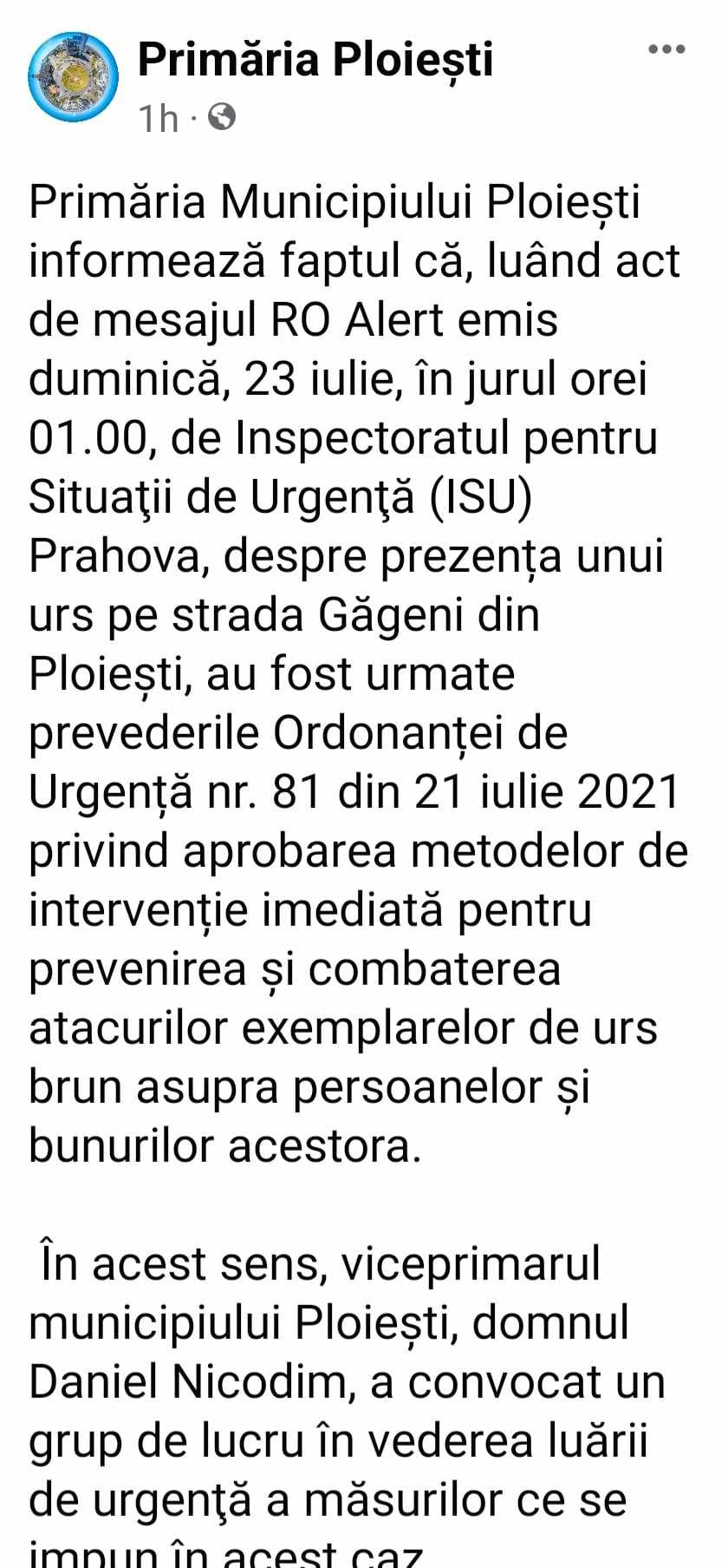Dupa principiul expus de senatorul Roberta Anastase, președintele PNL Ploiești („Jenant/SE PUPĂ SINGUR ÎN OGLINDĂ. JIGNEȘTE INTELIGENȚA PLOIEȘTENILOR”), izbăvitorul PSD-ist „primarul nostru de pluș” reactioneaza pe pagina oficiala a Primariei acum cca o ora, deci la peste 10 ore de la aparitia ursului.