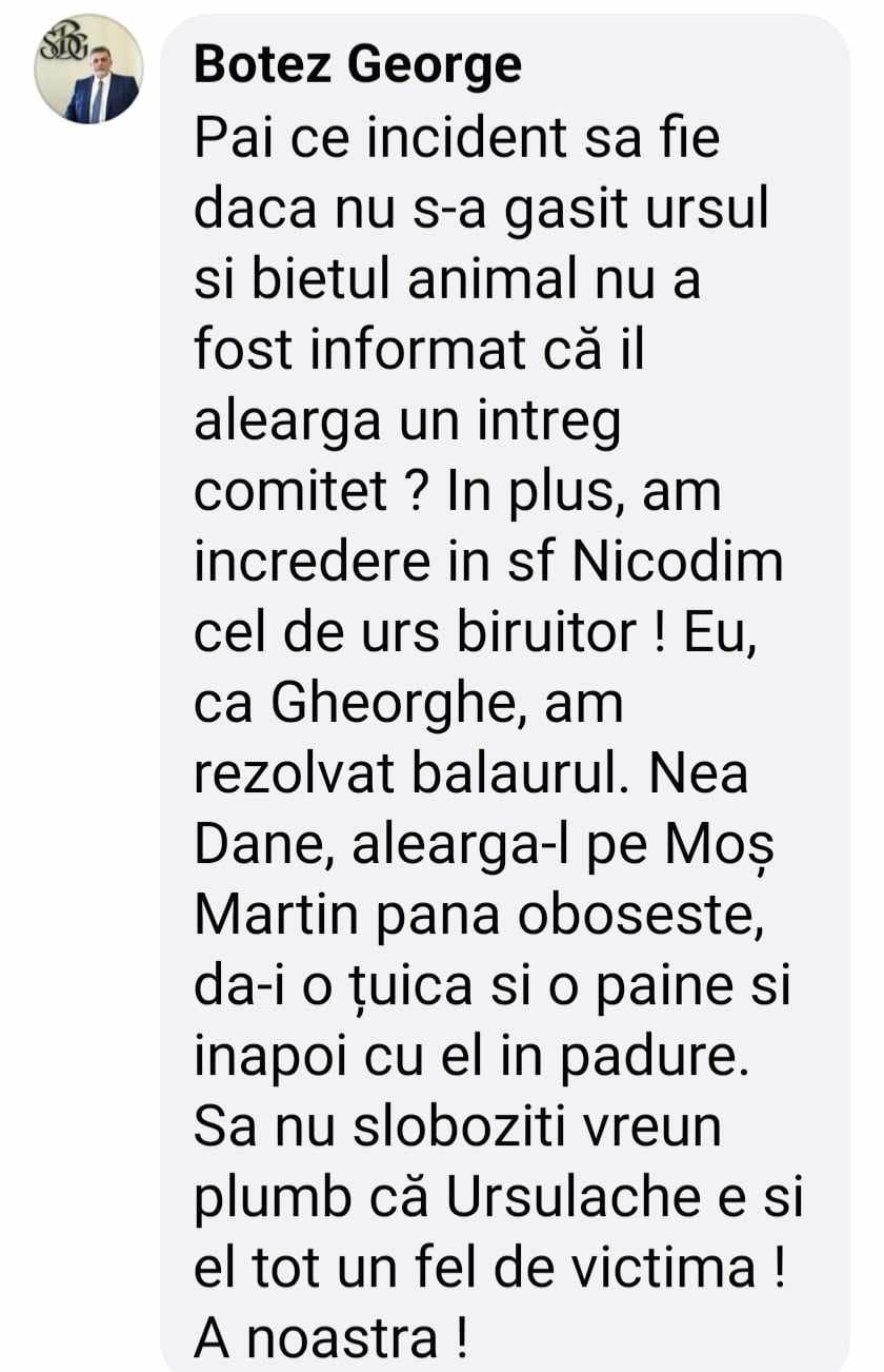 „Pai ce incident sa fie daca nu s-a gasit ursul si bietul animal nu a fost informat că il alearga un intreg comitet ? In plus, am incredere in sf Nicodim cel de urs biruitor ! Eu, ca Gheorghe, am rezolvat balaurul. Nea Dane, alearga-l pe Moș Martin pana oboseste, da-i o țuica si o paine si inapoi cu el in padure. Sa nu sloboziti vreun plumb că Ursulache e si el tot un fel de victima ! A noastra !”