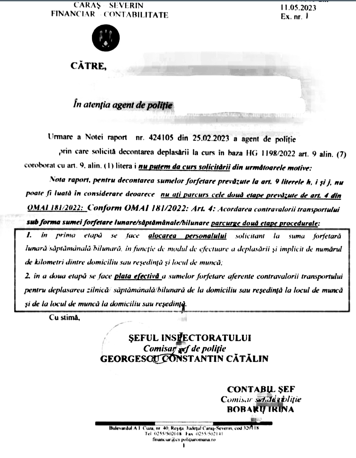 Răspunsul din partea IPJ Caraș-Severin,  ca urmare a solicitării Sindicatului Europol, nu a întârziat să apară de această dată, însă se demonstrează atât faptul că polițiștii au întocmit documentele aferente drepturilor de transport în mod corespunzător, cât și că la nivelul instituției există un grad imens de superficialitate în ceea ce privește înțelegerea prevederilor legale în vigoare referitoare la drepturile de transport ale angajaților.