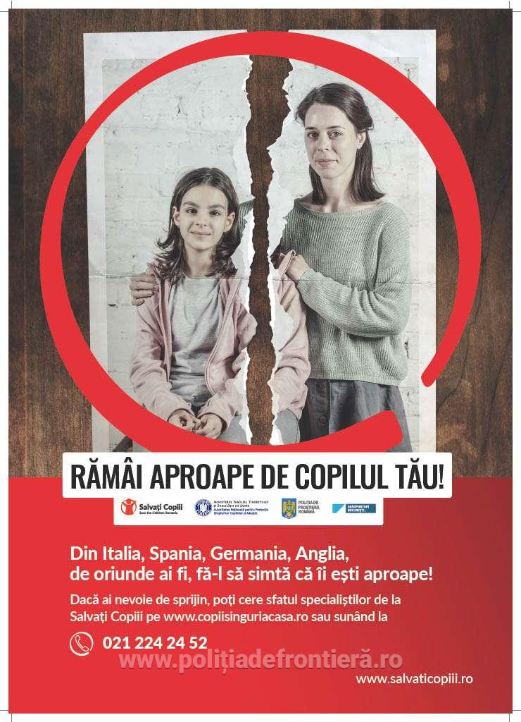 Pe parcursul lunii august, Organizația Salvaţi Copiii va derula, cu sprijinul Poliției de Frontieră Române, activități de informare destinate părinților care se întorc în țară cu privire la nevoile copiilor rămași acasă și importanța comunicării cu aceștia, la puncte de trecere a frontierei terestre și aeriene. Startul acestora va fi dat de activităţile realizate de specialiști și voluntari ai Organizației Salvați Copiii filiala Timiș în 9 august, la punctul de trecere a frontierei Nădlac II, cu sprijinul Inspectoratului Teritorial de Poliție de Frontieră Oradea.