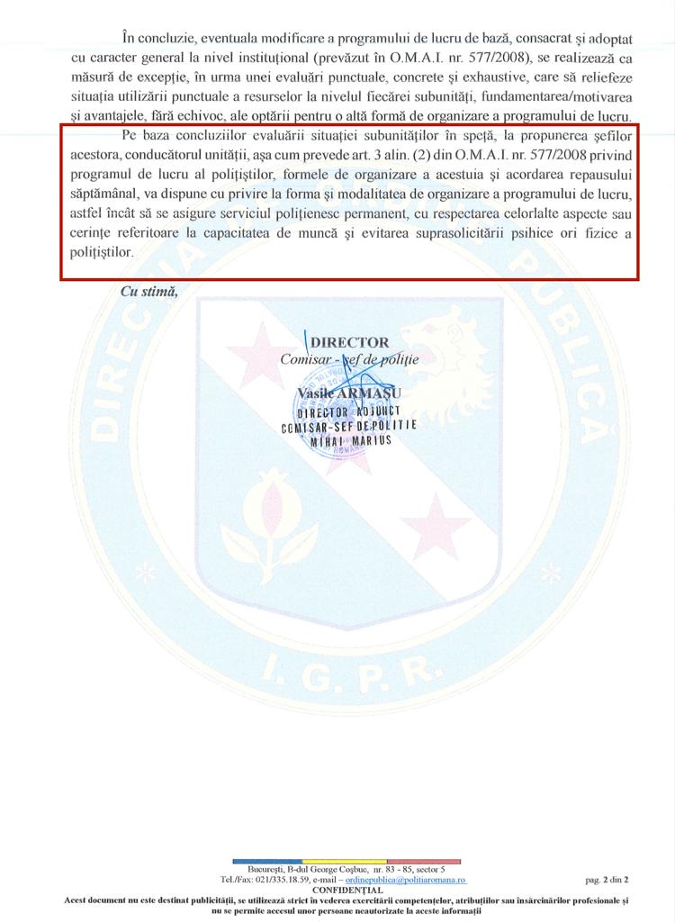 În concluzie, este extrem de relevant de reținut faptul că toate unitățile sau subunitățile de poliție din țară care au ca formă de organizare schimburi a câte 12 ore își pot păstra programul de lucru iar o eventuală modificare a acestuia nu poate avea la baza ca argument fișa cadru.