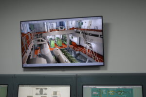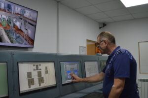 Turul continuă cu sălile în care fac exercițiile complexe: ce se poate întâmpla în realitate la bordul unei nave. Dacă sunt într-o curbă de girație cu cârma stânga și mi s-au oprit pompele, cârma rămâne blocată și mișcarea va fi încontinuu circulară. Trebuie să iau măsuri de siguranță, cea mai simplă și urgentă fiind ancorarea.