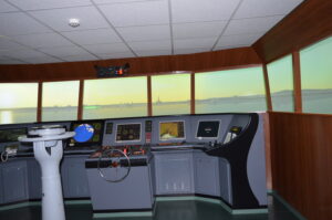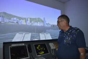 Și uite așa, începe turul. Cât ne plimbăm prin sălile simulatorului, ne întâlnim cu vizitatori și marinari veniți la instruire. Într-una dintre săli, o companie franțuzească de portcontainere își face trainingul, înainte de plecarea pe mare. Lucrează în porturile din China, zona este foarte aglomerată și, înainte de a ajunge efectiv acolo, deja cunosc portul, prin scenariul pus la dispoziție de noi.