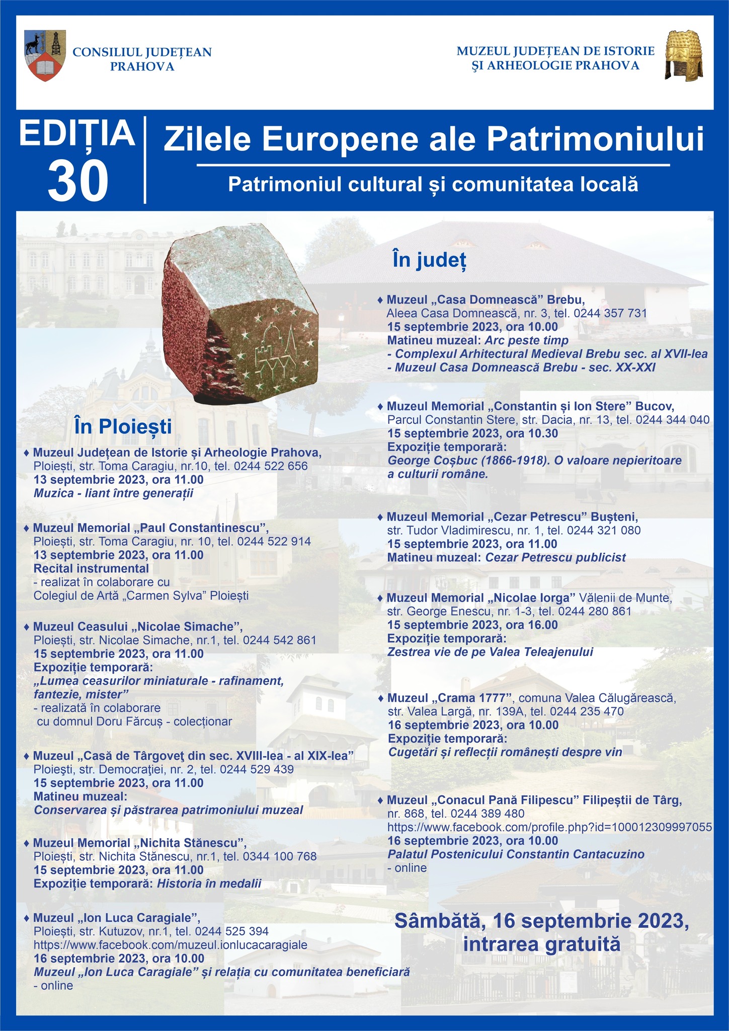În perioada 13-16 septembrie 2023, Ploieștiul și județul Prahova vor fi gazda unei serii de evenimente dedicate Zilelor Europene ale Patrimoniului