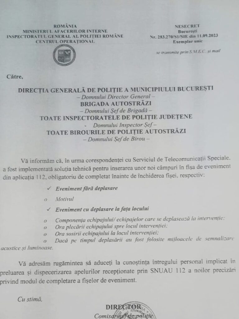 Spre exemplificare, indicăm adresa Centrului Operațional din cadrul I.G.P.R. cu nr. 280.273/S1/SIE din 11.09.2023, prin care se aduce la cunoștință unităților de poliție, faptul că ,,a fost implementată soluția tehnică pentru inserarea unor noi câmpuri în fișa de eveniment din aplicația 112, obligatoriu de completat înainte de închiderea fișei”, dezvaluie cei de la sindicatul Sidepol.