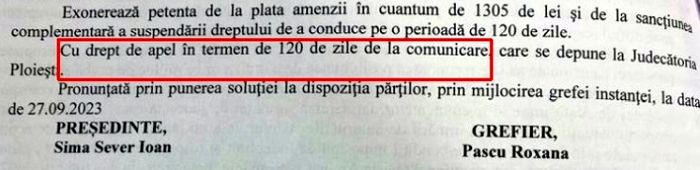 Gafa ii apartine judecatorului Sever Ioan Sima de la Judecatoria Ploiesti, care a pronuntat o sentinta intr-un banal proces privind o contraventie rutiera, dezvaluie Lumea Justitiei. Evident, nu poate fi vorba de atacarea sentintei in termen de 120 de zile de la comunicare, caci art. 468 alin. 1 din Codul de procedura civila stabileste „30 de zile de la comunicarea hotararii, daca legea nu dispune altfel”. Ceea ce s-a intamplat este amuzant, dar e doar o simpla eroare, care ulterior a si fost indreptata pe portalul instantei.
