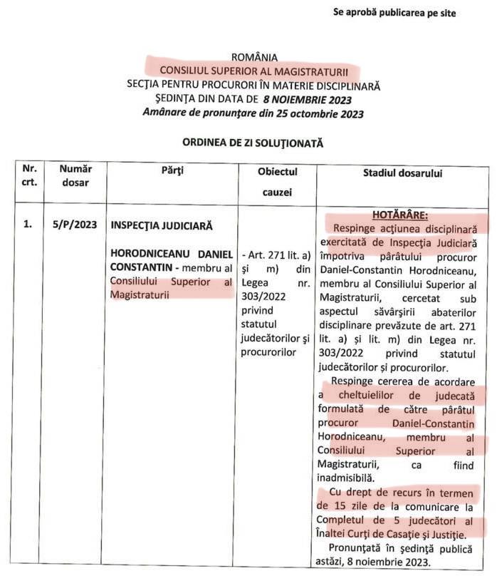 Ulterior, Inspecția Judiciară s-a autosesizat în acest caz, însă acțiuneaa disciplinară inițiată de împotriva lui Horodniceanu a fost respinsă acum de Secția pentru procurori a CSM.