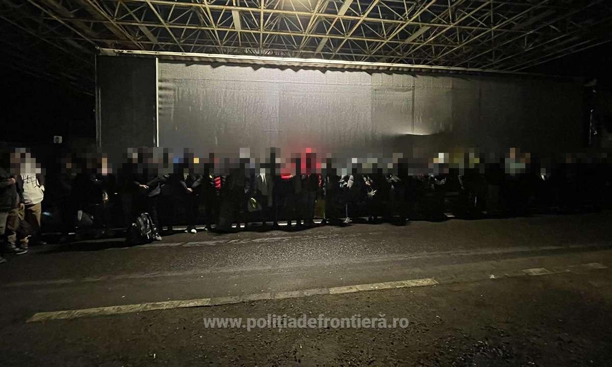 În urma efectuării controlului amănunţit al mijloacelor de transport, au fost descoperiţi, ascunşi în semiremorci, printre bunurile transportate, 70 cetăţeni străini.