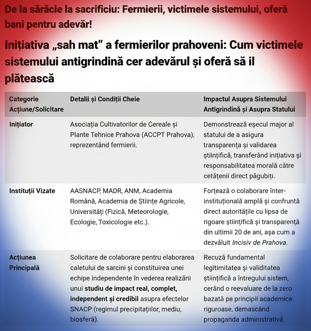 | Instituții Vizate | AASNACP, MADR, ANM, Academia Română, Academia de Științe Agricole, Universități (Fizică, Meteorologie, Ecologie, Toxicologie etc.). | Forțează o colaborare inter-instituțională amplă și confruntă direct autoritățile cu lipsa de rigoare științifică și transparență din ultimii 20 de ani, așa cum a dezvăluit Incisiv de Prahova. |