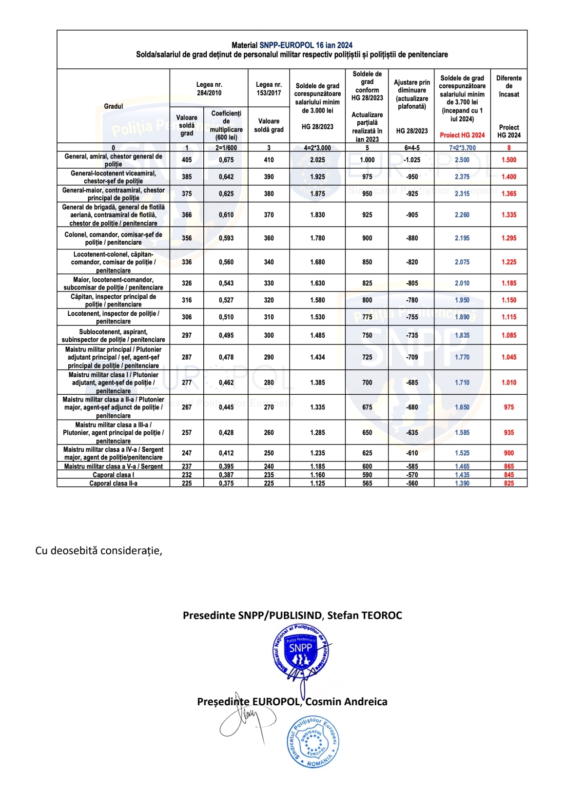 Într-un demers comun, Sindicatul EUROPOL și Sindicatul Național al Polițiștilor de Penitenciare cer miniștrilor de resort asumarea, inițierea și susținerea demersurilor legislative necesare pentru actualizarea valorii salariului de grad și respectiv plata efectivă a restanțelor calculate: