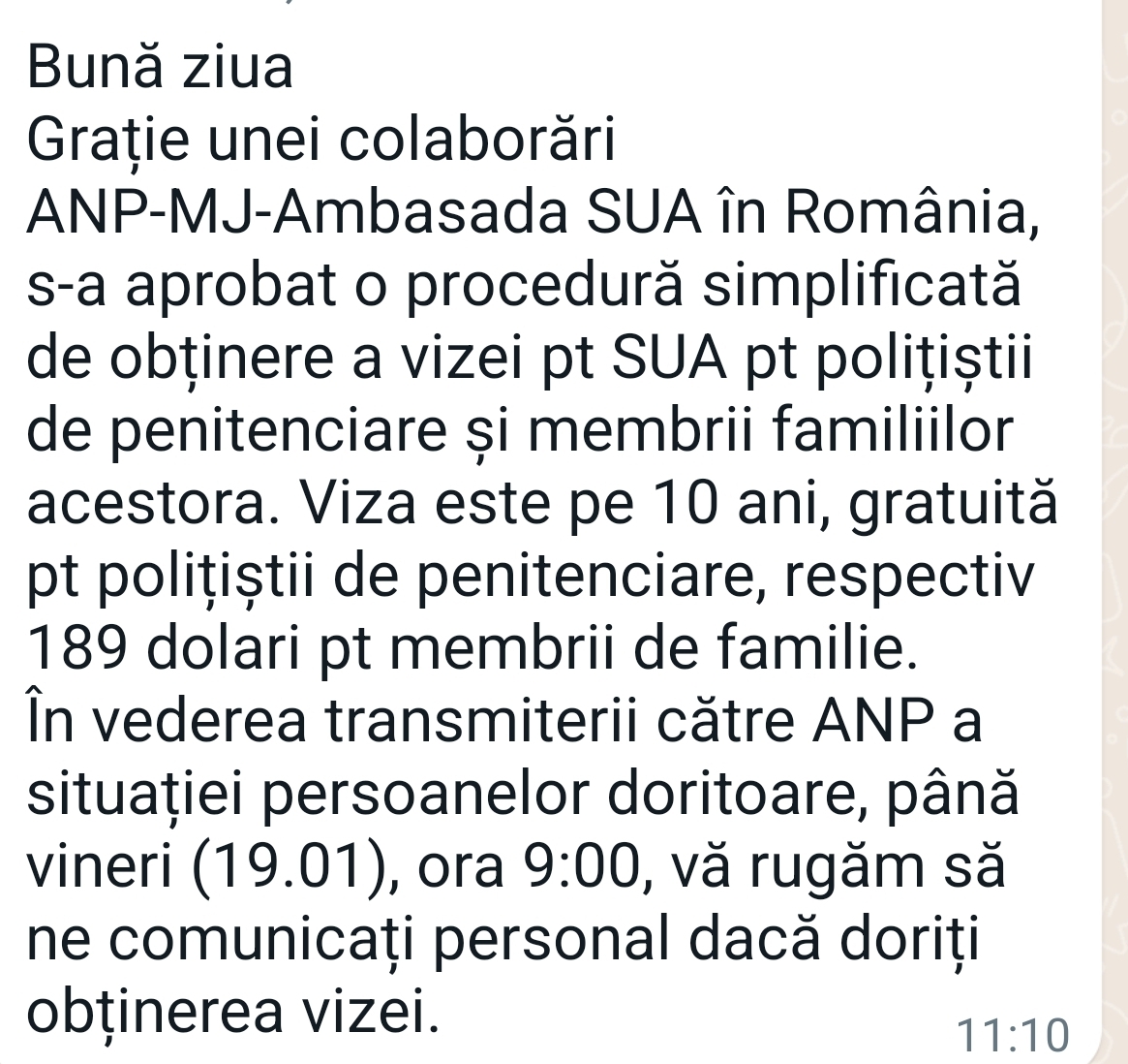 Acest mesaj ce circulă de ieri pe grupurile de whatsApp ar avea la bază o informație reală,o facilitate oferită pentru angajații din structura de apărare, ordine publică și siguranță națională, dar despre care 90% din directorii de penitenciare nu știau, fiind luați prin surprindere de angajații care au pus azi intrebări.