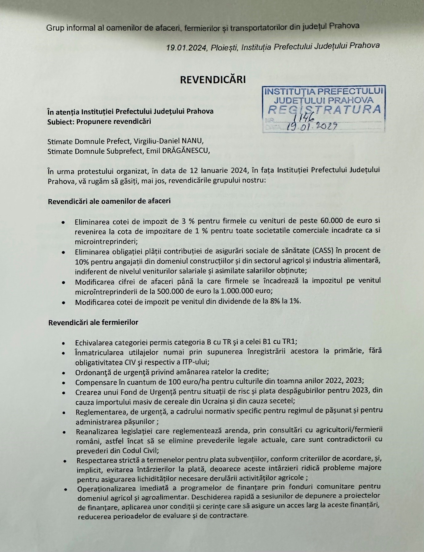Oameni de afaceri, transportatori și agricultori din județul Prahova care au manifestat cu demnitate și curaj, pe drumurile județului Prahova, pe 12 Ianuarie 2024, au reușit să îl determine pe prefectul de Prahova, Virgiliu – Daniel Nanu să deschidă ușa negocierilor cu cei care și-au cerut, public, dreptul la o viață mai bună în țara lor, după ce Guvernul a decis să impună „legea austerității” prin creșteri de taxe și impozite.