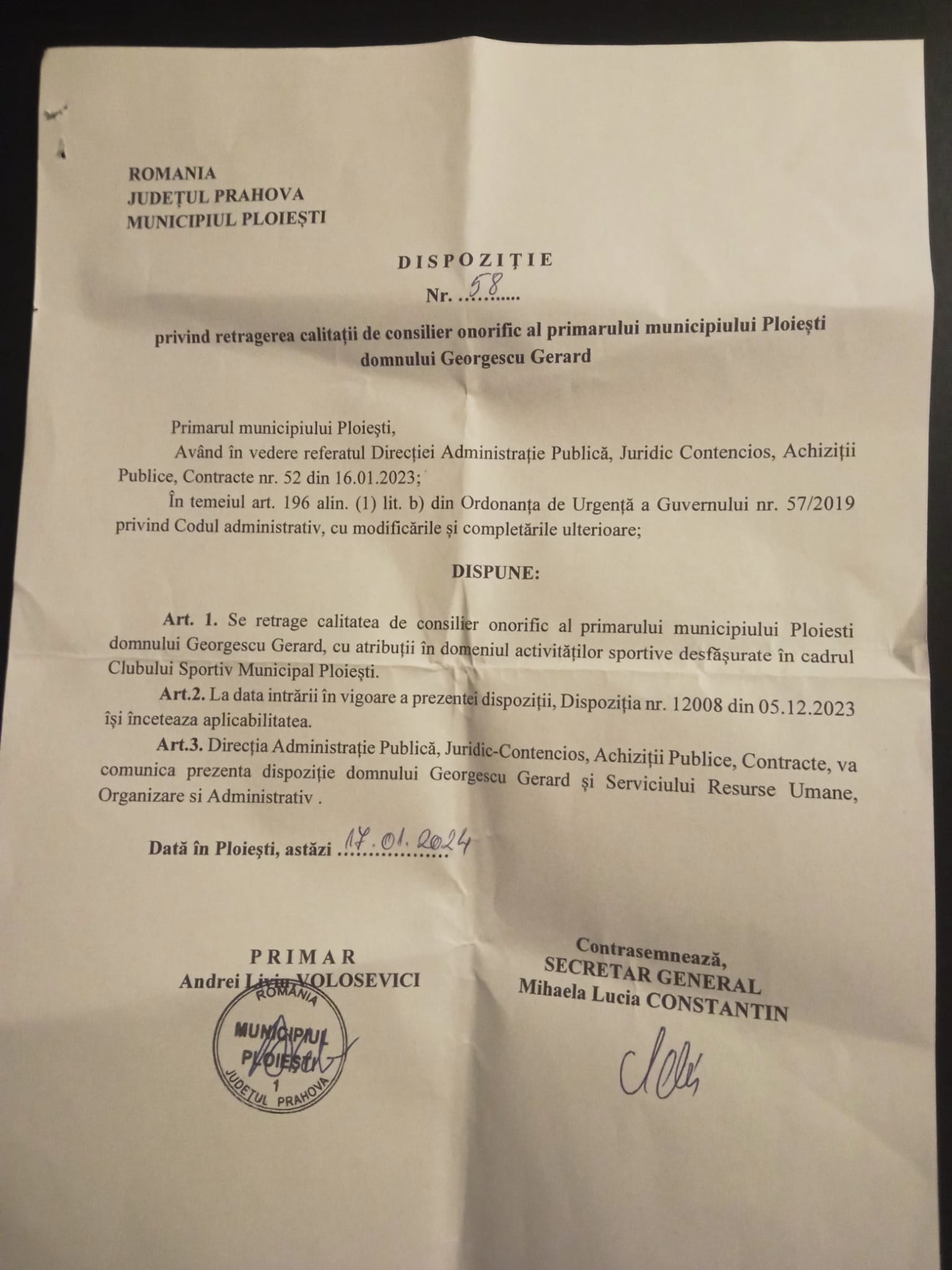Gerard Georgescu, care a fost numit pe 5 decembrie 2023 consilierul onorific al primarului Andrei Volosevici (membru PNL și candidat al PSD la un nou mandat), a anunțat că nu va mai colabora cu edilul din cauza situației de la Clubul Sportiv Municipal (CSM) Ploiești. Acesta i-a adus acuzații grave primarului Volosevici într-o serie de postări pe pagina sa de Facebook.