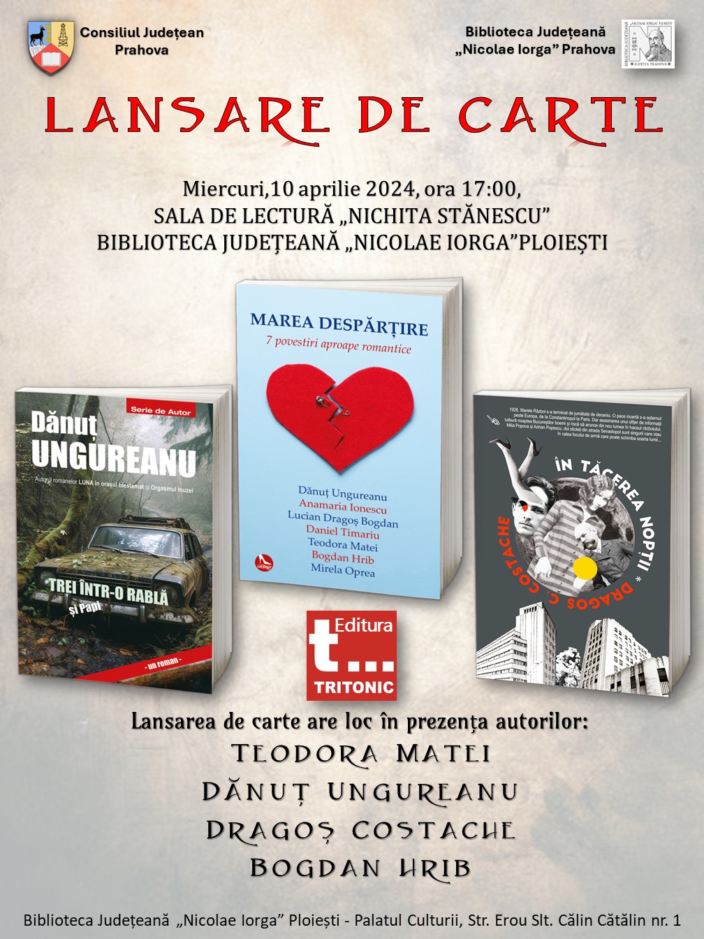 Biblioteca  Județeană „N. Iorga” din Ploiești organizează miercuri, 10 aprilie 2024, de la ora 17.00, în Sala de lectură „N. Stănescu”, lansarea unor volume remarcabile, publicate de Editura Tritonic în anul 2023.