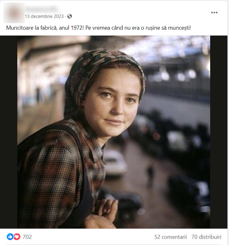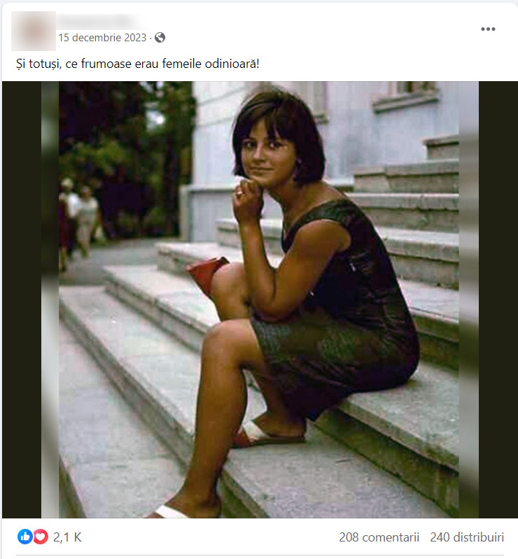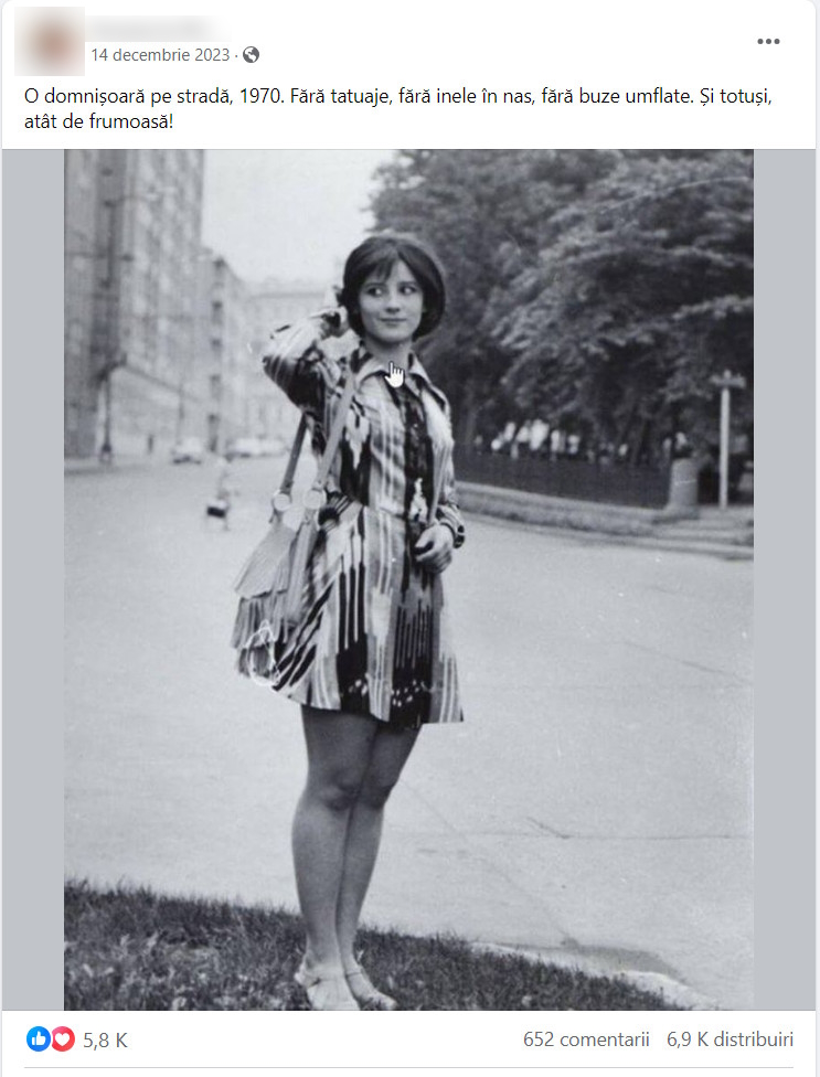 Autorul postării, pe o pagină de Facebook cu peste 40 de mii de urmăritori, se declara nostalgic după o aparentă formă de feminitate, dispărută între timp. Fotografia era descrisă astfel: O domnișoară pe stradă, 1970. Fără tatuaje, fără inele în nas, fără buze umflate. Și totuși, atât de frumoasă! Am descoperit aceeași fotografie, recent, într-o postare asemănătoare, pe o pagină cu conținut istoric, iar descrierea fotografiei, făcută în Tașkent, Uzbekistan, titra: Undeva în România anilor ’70. Am decis să cercetez în amănunt.