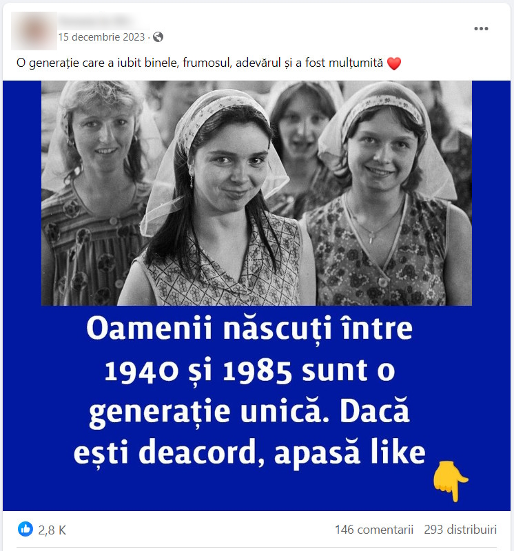 Postările nu nasc dezbateri, ci doar aprobări în cor și distribuiri care duc mai departe mesajul subliminal. Iar pentru prezentul „greu”, pentru lipsurile și crizele actuale trebuie, în mod normal, să se facă vinovat cineva.