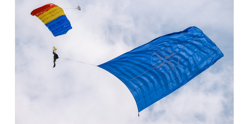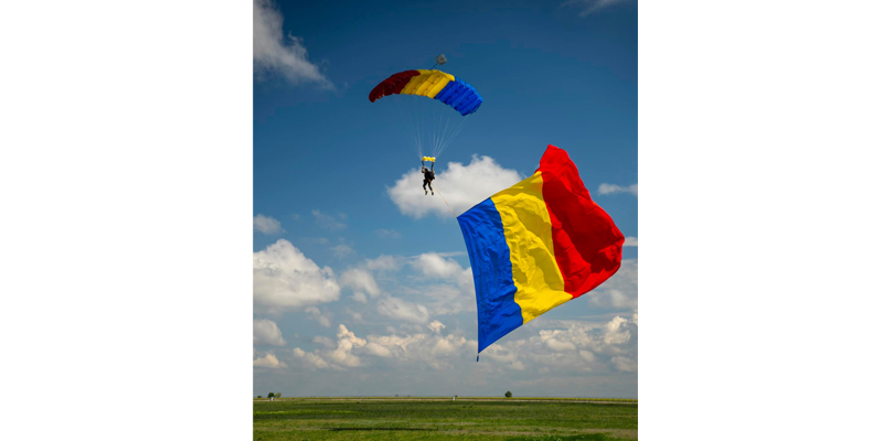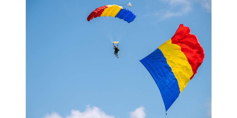 Programul a fost deschis de un exerciţiu asimilat din planul de pregătire al piloţilor români de F-16 Fighting Falcon, după care a urmat desantul dintr-un avion C-27J Spartan al Bazei 90 Transport Aerian a trei paraşutişti militari ce au avut asupra lor drapelele României, NATO şi UE, fiecare măsurând 96 de metri pătraţi.