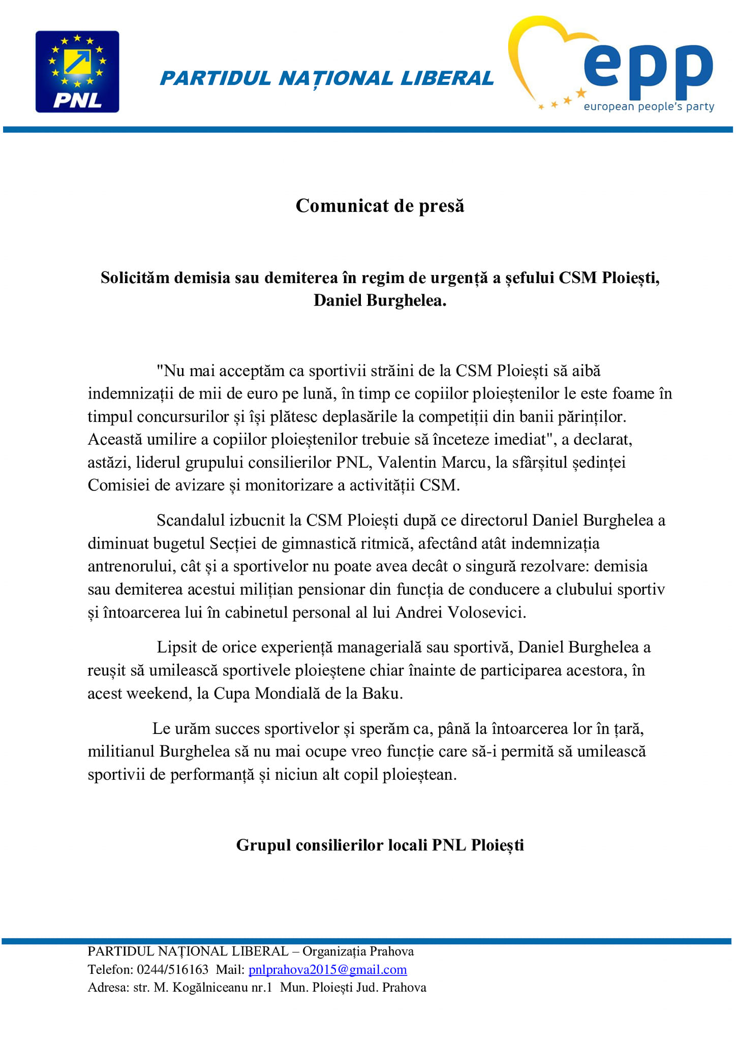 PNL Ploiesti solicită din nou demisia sau demiterea în regim de urgență a șefului CSM Ploiești, Daniel Burghelea.