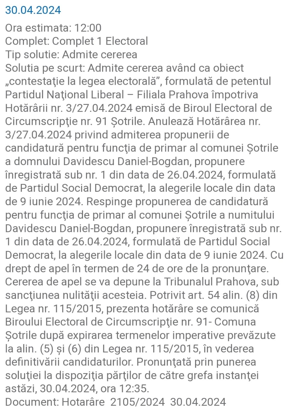 Soluția pe scurt: „Admite cererea având ca obiect contestație la legea electorală, formulată de petentul Partidul Național Liberal – Filiala Prahova împotriva Hotărârii nr. 3/27.04.2024 emisă de Biroul Electoral de Circumscripție nr 91 Șotriile. Anulează Hotărârea nr. 3/27.04.2024 privind admiterea propunerii de candidatură pentru funcția de primar al comunei Șotriile a domnului Davidescu Daniel Bogdan, propunere înregistrată sub nr.1 din data de 26.04.2024, formulată de Partidul Social-Democrat, la alegerile locale din data de 9 iunie 2024. Respinge propunerea de candidatură pentru funcția de primar al comunei Șotriile a numitului Davidescu Daniel Bogdan, propunere înregistrată sub nr.1 din data de 26.04.2024, formulată de Partidul Social-Democrat, la alegerile locale din data de 9 iunie 2024. Cu drept de apel în termen de 24 de ore de la pronunțare. Cererea de apel se va depune la Tribunalul Prahova , sub sancțiunea nulității acesteia.”