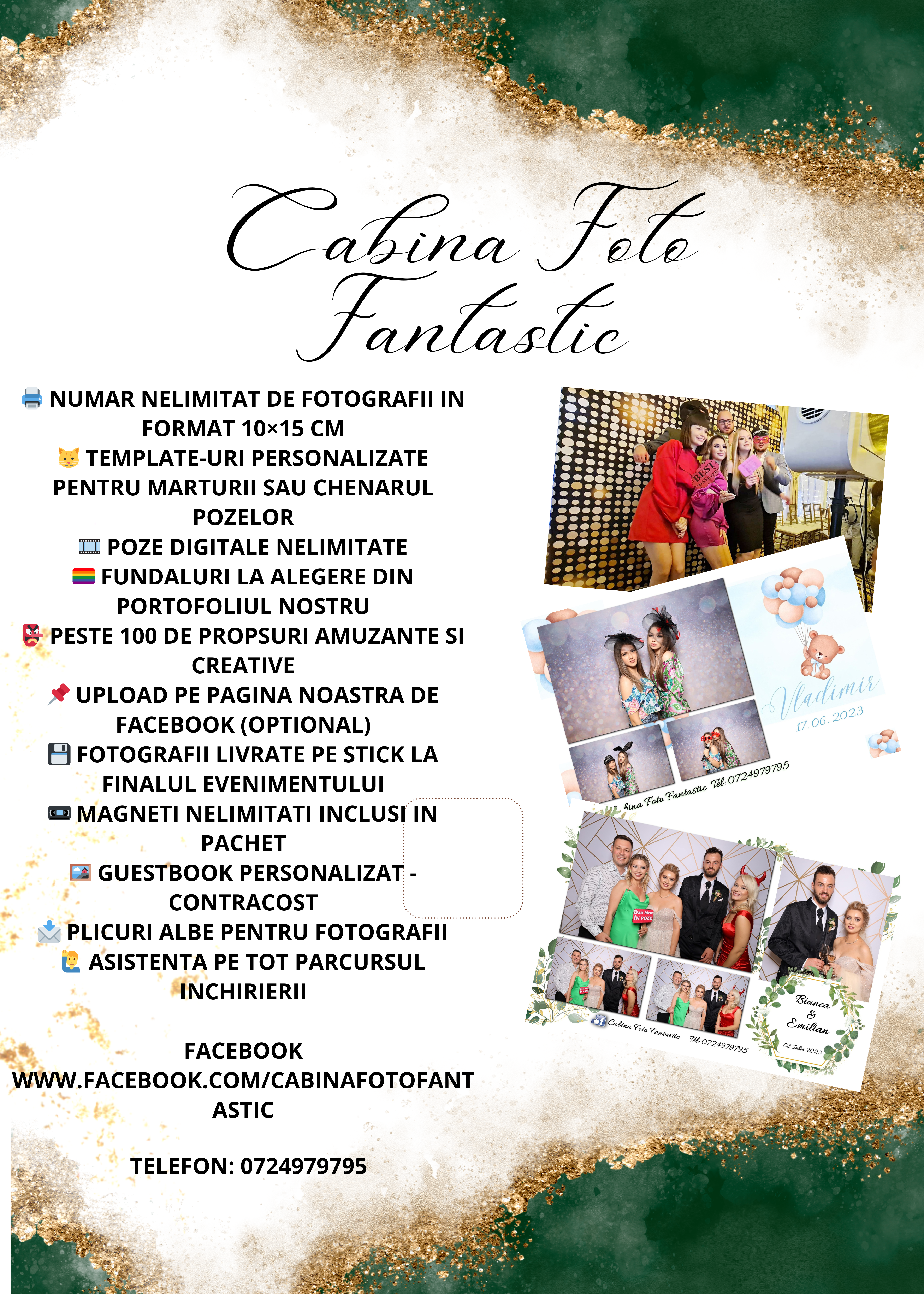 - Cabina Foto Digitală: Utilizează tehnologie modernă pentru a oferi fotografii digitale și printate, cu opțiuni extinse de personalizare, precum adăugarea de texte și logo-uri.