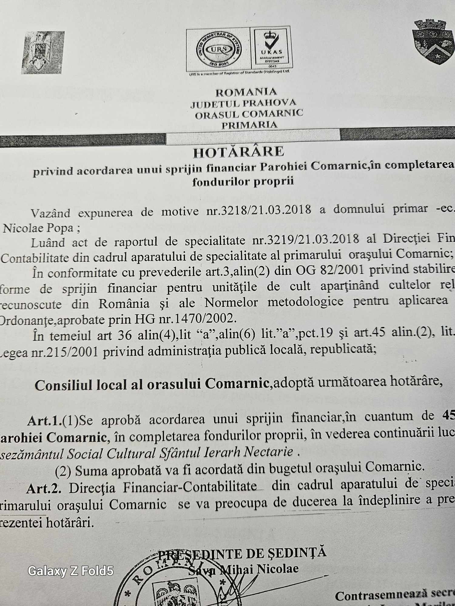 II) Iata ca si in anul 2018, Parohia Comarnic a primit un sprijin financiar in suma de 45.000 lei, conform HCL 33/27.03.2018.