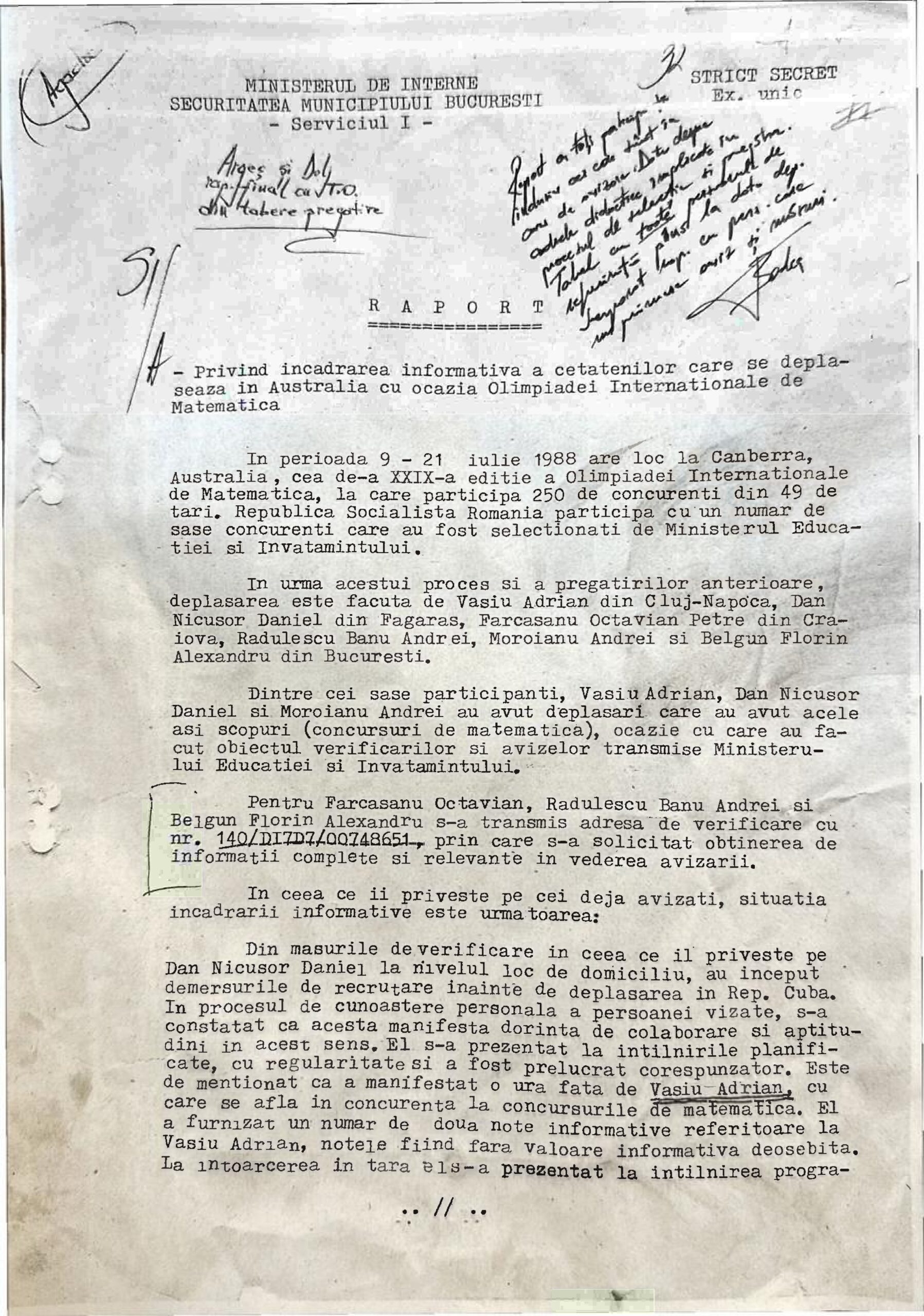 ”Față de documentul “Raport privind încadrarea informativă a cetățenilor care se deplasează în Australia cu ocazia Olimpiadei Internaționale de Matematică” care a început să circule în presă fac următoarele precizări: