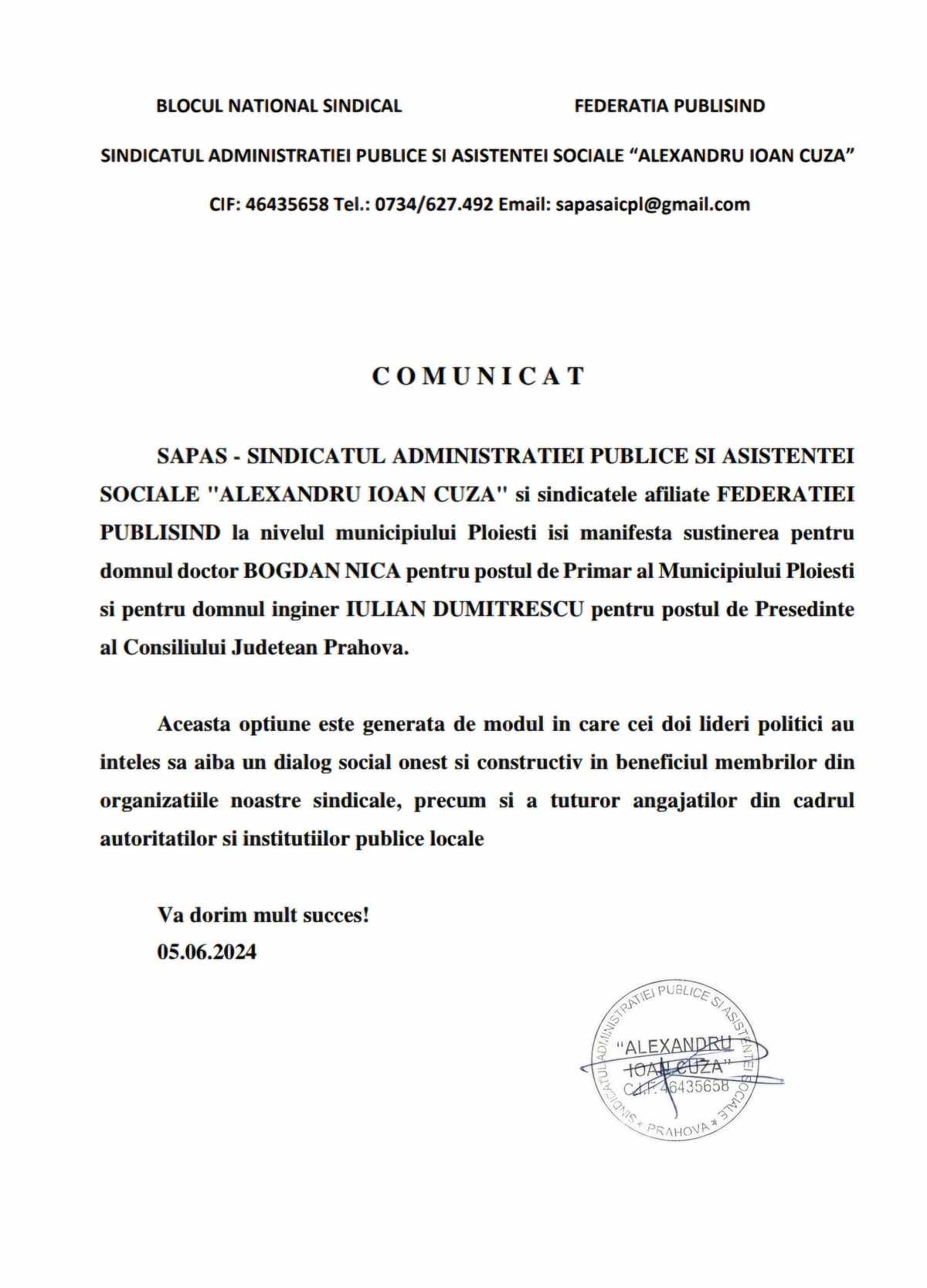 O Noua Bomba ce anunta dezastrul Clanului Cosma si PSD-ului Prahova/Exclusiv/SAPAS – SINDICATUL ADMINISTRATIEI PUBLICE SI ASISTENTEI SOCIALE „ALEXANDRU IOAN CUZA” si sindicatele afiliate FEDERATIEI PUBLISIND la nivelul municipiului Ploiesti isi manifesta sustinerea pentru domnul doctor BOGDAN NICA pentru postul de Primar al Municipiului Ploiesti si pentru domnul inginer IULIAN DUMITRESCU pentru postul de Presedinte al Consiliului Judetean Prahova.
