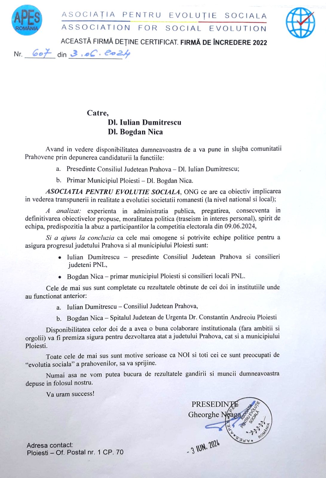 Un nou sprijin pentru echipa Iulian Dumitrescu (presedintele Consiliului Judetean Prahova) – Bogdan Nica (primarul municipiului Ploiesti) si din partea Asociatiei Pentru Evolutia Sociala