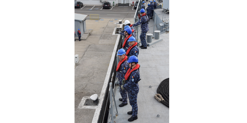 Fregata s-a desprins elegant de la cheu și s-a îndreptat spre ieșirea din port, navigând cu atenție printre alte ambarcațiuni și obstacole. Pe durata ieșirii din acvatoriu, echipajul a fost în alertă pentru detectarea şi respingerea ambarcațiunilor suspecte.