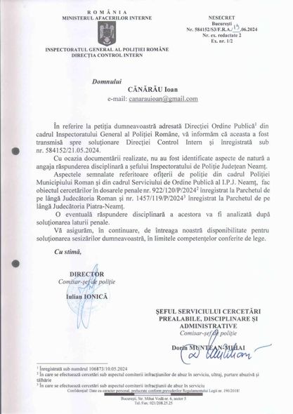 Potrivit sindicatului, Ionică Iulian a uitat brusc prevederile procedurii la care a contribuit, care stipulează clar că în cazul în care o posibilă abatere este investigată ca infracțiune, cercetarea disciplinară trebuie suspendată până la soluționarea definitivă a cauzei penale. Într-un incident în care liderul sindicatului a fost agresat de către inspectorul șef Ghercă Bogdan la sediul Poliției Roman, Ionică Iulian pretinde că posibilele acțiuni disciplinare împotriva agresorilor și a superiorilor lor vor fi „analizate” doar după finalizarea procedurilor penale. Aceasta ar însemna că posibilele sancțiuni disciplinare nu ar mai putea fi aplicate din cauza termenului de prescripție, permițând ofițerilor să evite sancțiunile. Sursa citată adaugă că Poliția Română pare să protejeze polițiștii agresori, iar comportamentul directorului Direcției Control Intern, care pare să încurajeze violența șefilor împotriva subordonaților, ridică noi semne de întrebare privind integritatea etică în cadrul instituției. (Cristina T.).