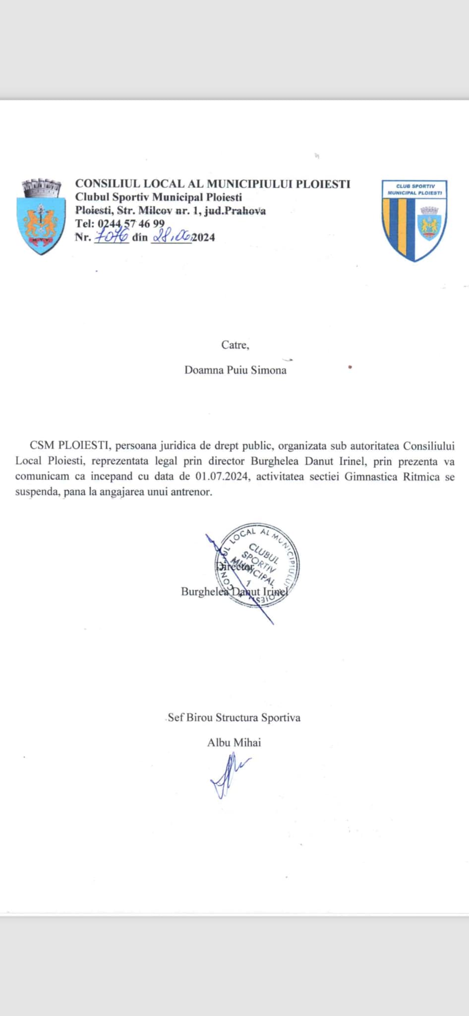 Micile gimnaste de la CSM Ploiești au câștigat aur, argint și bronz la Cairo în ziua în care conducerea clubului a anunțat suspendarea activității secției. Ingrid Gavril și Delia Stroe au obținut trei medalii, iar Sabina Enache și Elena Murărescu s-au calificat în finalele obiectelor. Rezultatele au fost anunțate de părinți pe o pagină de Facebook a secției. Situația a stârnit reacții vehemente în spațiul public, inclusiv din partea senatorului PNL Roberta Anastase, care a cerut măsuri împotriva directorului CSM Ploiești (aici). Aceasta a transmis un mesaj către autorități pentru a opri suspendarea activității secției de gimnastică ritmică.