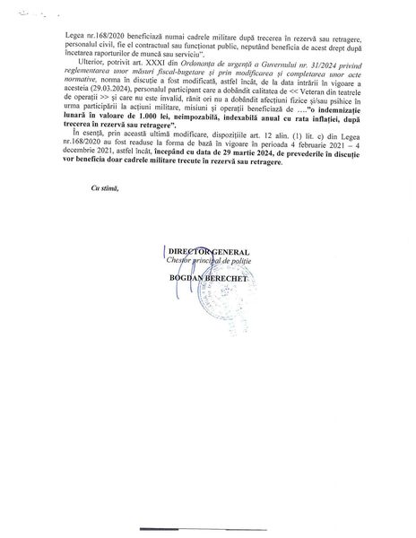 Un agent ne reclama că, la Constanța, un ofițer coordonator nu știe că există dreptul la pauza de masă (stabilit la art. 134 Codul Muncii ca principiu și precizat în acordul colectiv de serviciu în vigoare la MAI). Suplimentar, dacă luați ROI-urile IPJ-urilor la puricat, găsiți și acolo o prevedere clară privind dreptul la pauza de masă! Azi, dam de alți proști! Vedem în foto cum prostia financiarului DGPMB provoacă victime în rândul veteranilor în teatrele de operațiuni. Niște nătărăi de la financiarul capitalei au suprimat ei, cu de la ei putere, dreptul la indemnizația de veteran prevăzută de Legea 168/2020, unui ofițer care și-a dat demisia din poliție, doar pentru că ciumpalacii nu au aflat că, la incetarea raportului de serviciu (prin orice modalitate!), ofițerii și agenții de poliție sunt trecuți în rezervă sau direct în retragere (cei cu inapt). Chiar și cei destituiți sunt trecuți în rezervă (adică li se echivalează gradul profesional cu grad militar și sunt trecuți în evidența rezerviștilor militari).