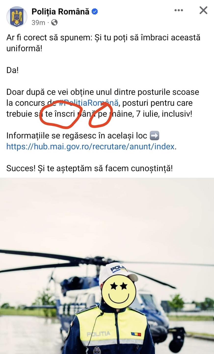 Sindicatul Europol atrage atenția asupra erorii apărute pe site-ul oficial al MAI referitoare la viitoarele angajări: „Ar fi corect să spunem: Și tu poți să îmbraci această uniformă! Da! Doar după ce vei obține unul dintre posturile scoase la concurs de Poliția Română, posturi pentru care trebuie să te înscrii până mâine, 7 iulie, inclusiv!