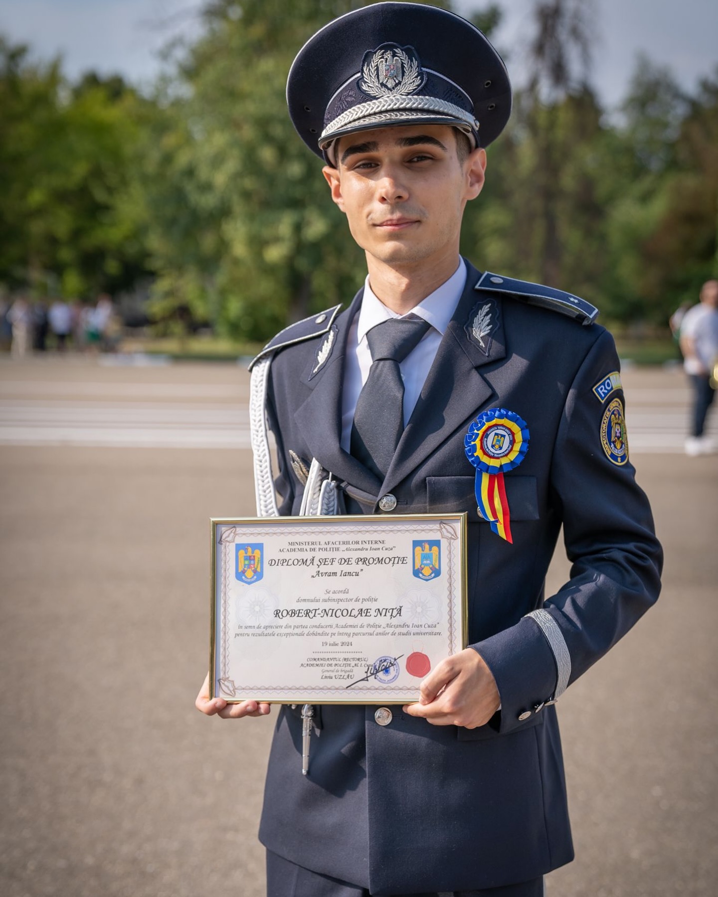 Numele lui este ROBERT NIȚĂ, absolvent al Academiei de Poliție și ȘEFUL PROMOȚIEI, cu o medie impresionantă de 9,90. Această realizare este o dovadă a muncii asidue, devotamentului și integrității de care a dat dovadă pe parcursul celor patru ani de studiu.