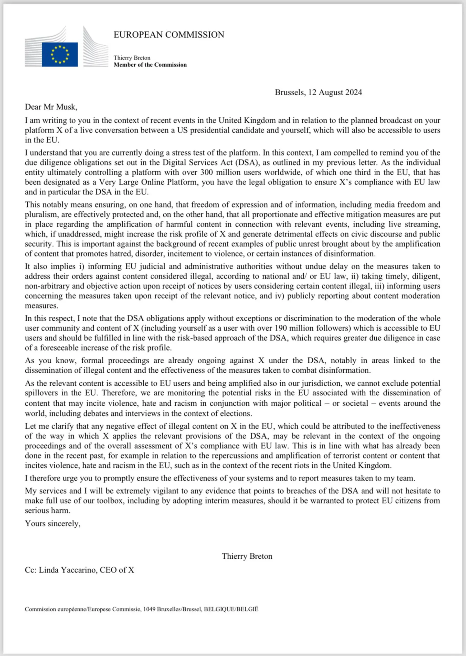 Această declarație sugerează că platforma X ar putea fi supusă restricțiilor în timpul interviului, dacă se fac afirmații considerate „necorespunzătoare”. Breton a menționat că este esențial să se protejeze atât libertatea de exprimare, cât și pluralismul mass-media, asigurând în același timp măsuri eficiente pentru a reduce amplificarea conținutului dăunător legat de evenimente relevante. „Acest lucru este contraindicat în lumina exemplelor recente de tulburări publice generate de conținut ce promovează ura, dezordinea, incitarea la violență sau dezinformarea”, se mai specifică în scrisoare.