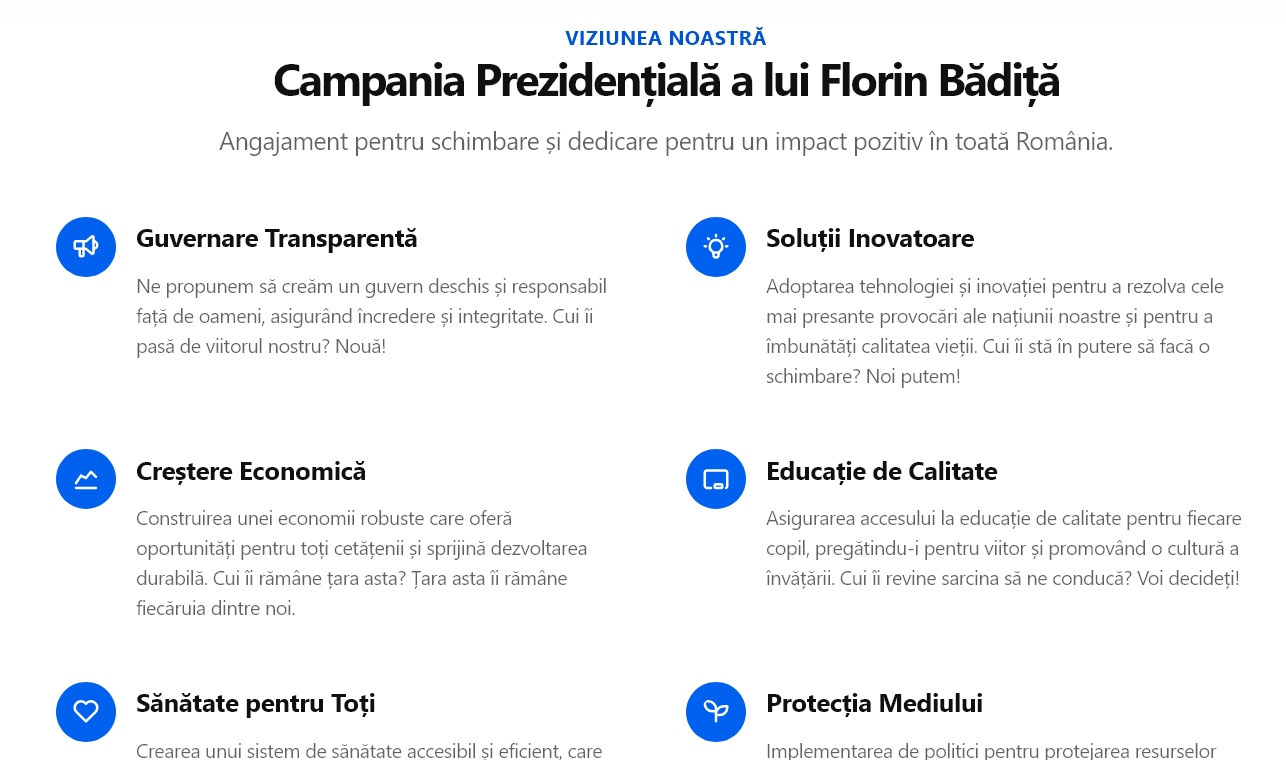 Cu un nou site de campanie, badita.org, plin de declarații provocatoare, Bădiță îndeamnă cetățenii să se alăture viziunii sale inovatoare: „Florin Bădiță aduce o perspectivă proaspătă și un angajament pentru schimbări reale în România. Alătură-te nouă pentru a construi un viitor mai luminos pentru toți.” Prin această promisiune inedită, candidatul reușește să capteze atenția unei mase semnificative de consumatori, ceea ce ar putea să-l propulseze în turul doi al competiției electorale.