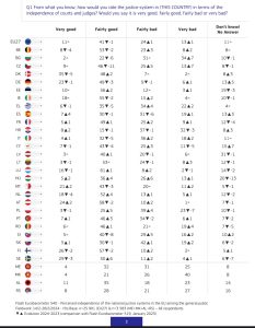 Sondajul realizat cu privire la sistemul judiciar din România, care a stat la baza concluziilor, arată că 52% dintre respondenti percep independența justiției române ca fiind bună și foarte bună. Același procent de 52% este și procentul mediu cu privire la independența justiției în cadrul Uniunii Europene.