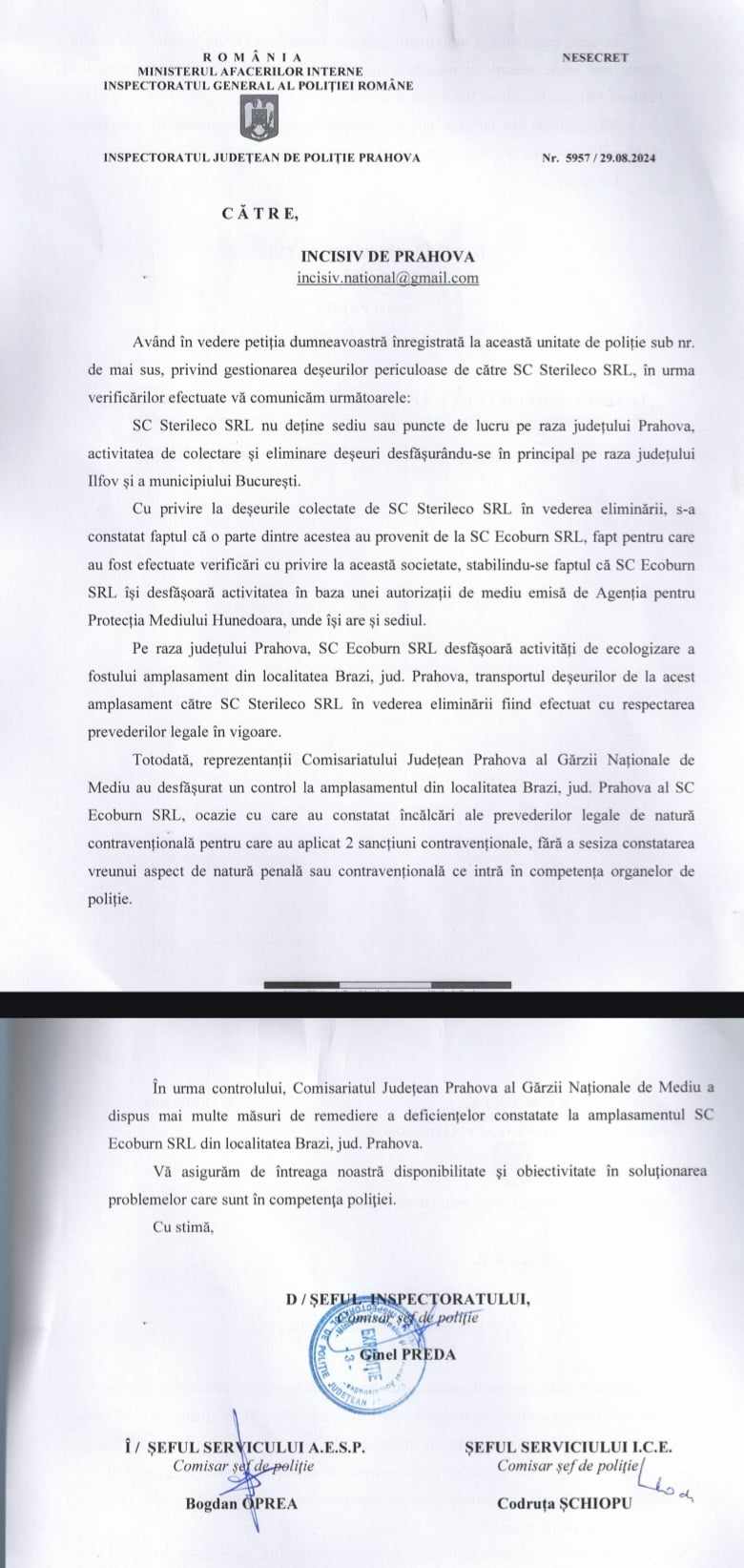 Analizând cele trei răspunsuri primite de la Administrația Prezidențială, Garda Națională de Mediu și IPJ Prahova, împreună cu observațiile noastre detaliate, am identificat câteva puncte esențiale care evidențiază posibilele probleme de transparență și integritate în gestionarea deșeurilor periculoase, în special în cazul SC Sterileco SRL.