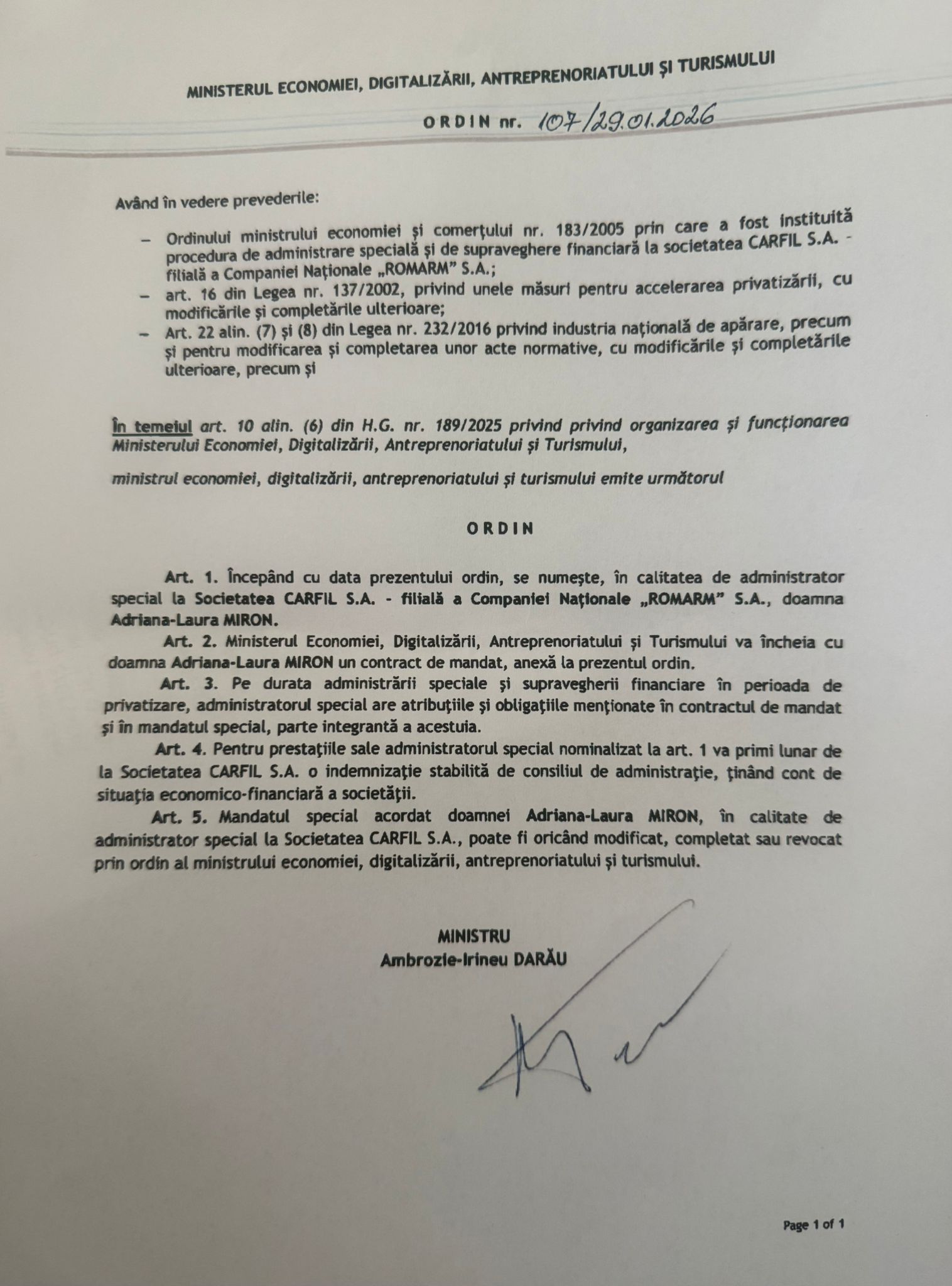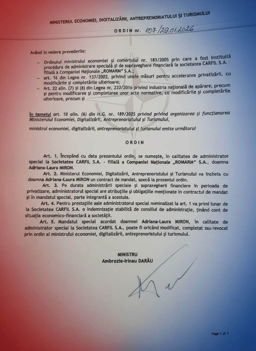 Investigația noastră scoate la iveală un document care ar face să roșească orice manual de integritate: Ordinul nr. 107 din 29 ianuarie 2026. Prin acest act, ministrul „reformator” Ambrozie-Irineu Darău o instalează pe Adriana Miron la cârma „Carfil” S.A., subunitate strategică a ROMARM. Miron nu e doar un biet consilier care plimbă mape; prin acest ordin, ea a fost unsă „Administrator Special”. Adică, un fel de „stăpân peste bani și puști”, cu puteri extinse asupra unei fabrici de armament, deși biografia ei este pătată de lupa DNA-ului în dosarele de la Brașov.