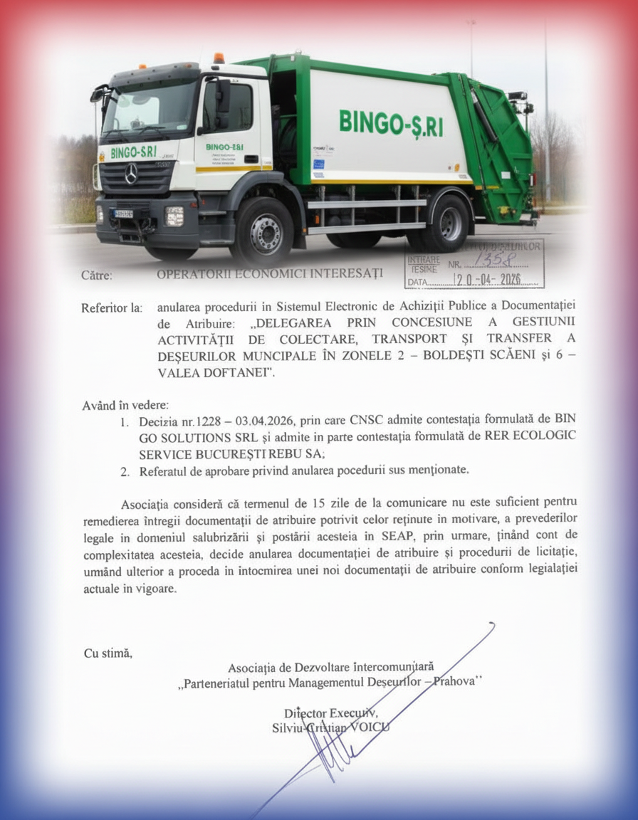 Cireașa de pe muntele de gunoi a fost pusă chiar ieri, 20 aprilie 2026, printr-un document oficial care probează „noaptea minții” administrative. Directorul executiv al ADI Prahova, Silviu-Cristian Voicu, a semnat actul prin care procedura de licitație pentru Zonele 2 și 6 este anulată definitiv. Motivul? O recunoaștere penibilă a propriei neputințe: ADI consideră că termenul de 15 zile impus de CNSC prin Decizia nr. 1228/03.04.2026 nu este „suficient pentru remedierea întregii documentații”.
